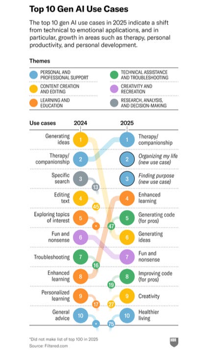 Zao-Sanders is the author of a Harvard Business Review article, now in its second edition, titled “How People Are Really Using GenAI in 2025.” You’ll find in it the full detail of results, methodology, and further insights from his analysis. But what makes the piece fascinating is not only the data itself. It is the insights it reveals onto everyday behavior — and the many reflections it invites.